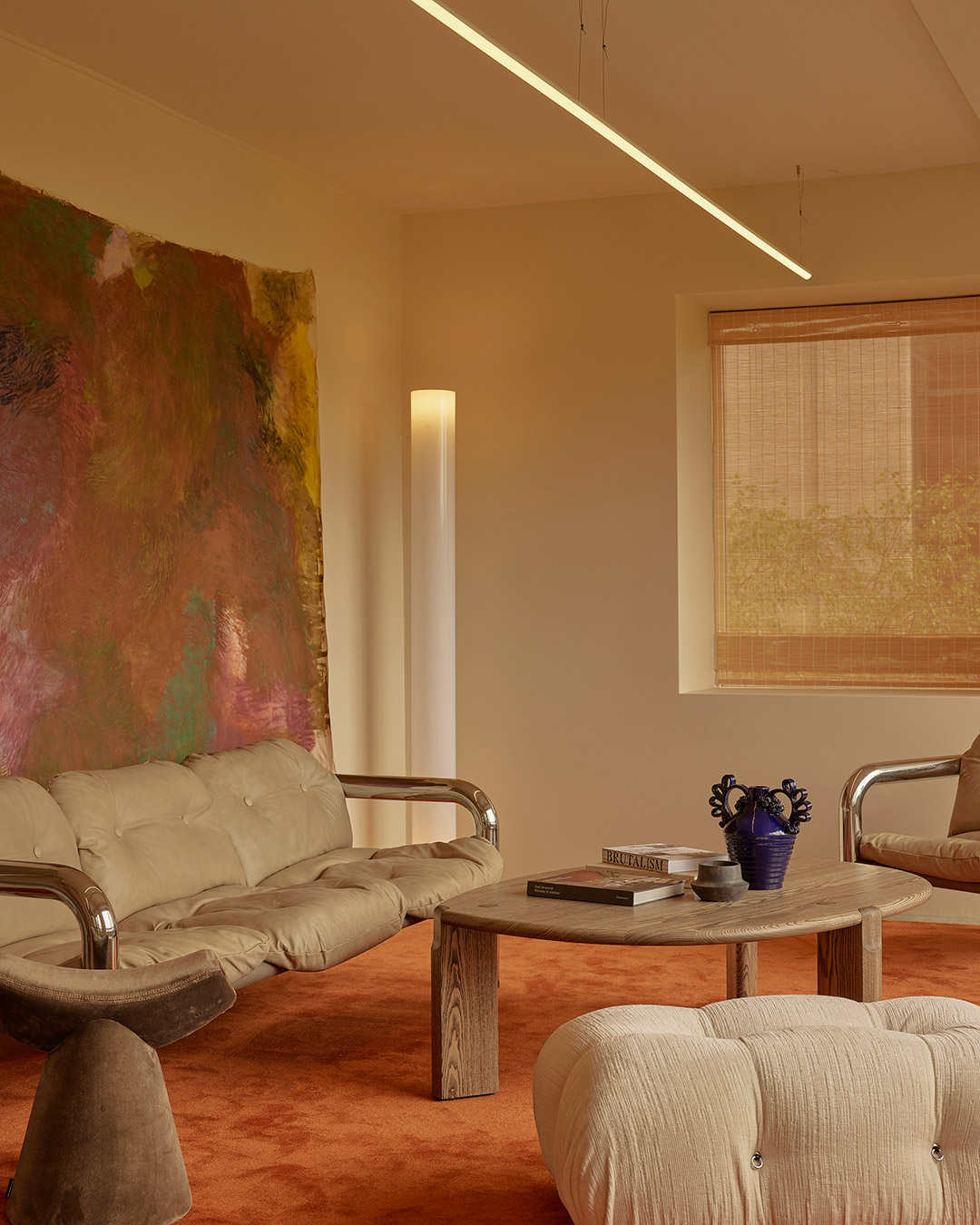 “The design of GOLDEN’s flagship Melbourne studio, located between St Kilda Road boulevard and The Fawkner Park, captures views of the expansive protected gardens from both levels.” The project features numbers from the Australian-made Symphony Lighting range.
