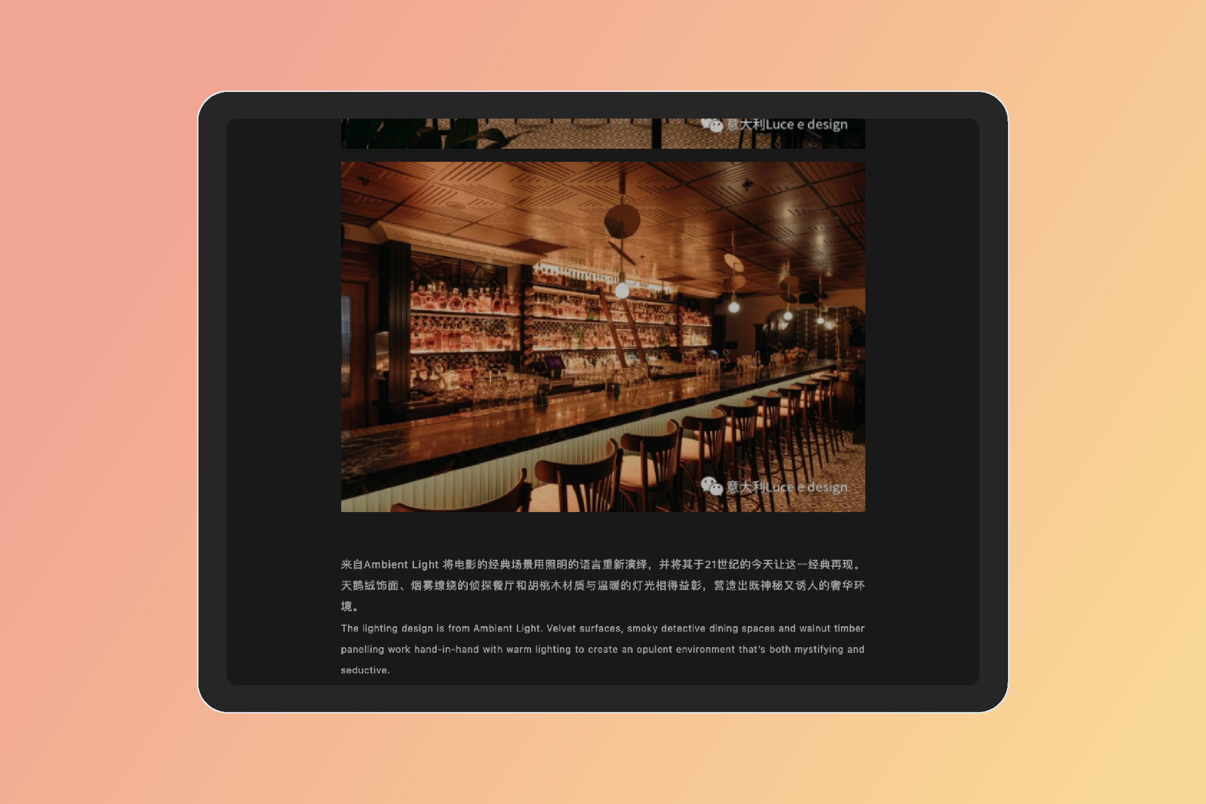 Nick & Nora’s Melbourne has received a number of accolades and awards around the globe including LIT Lighting Design Awards 2021 WINNER in Hotel & Restaurants Lighting Design and Winner at the Restaurant & Bar Design Awards. So we were again chuffed that China’s biggest lighting design publication, Luce E Design China (a sister title of the Italian publication) showcased Nick & Noras. The project featured a mix of luminaires including Symphony and custom from Ilanel.