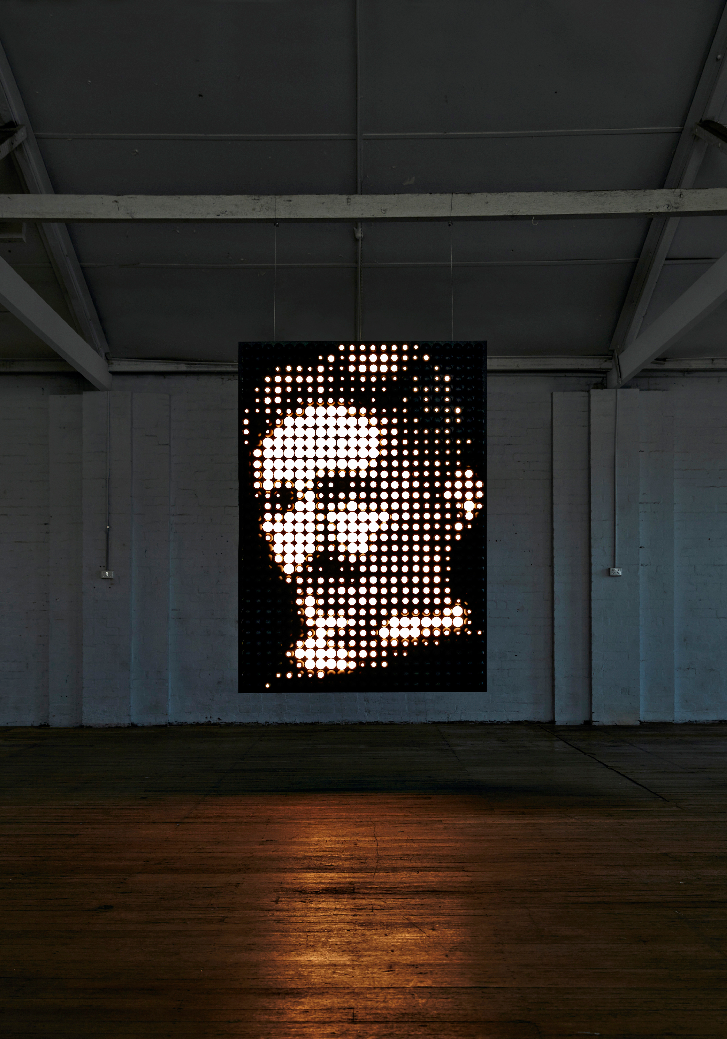 This was a real labour of love done over many months with the concept execution being a complex task for what in essence is a very simple technique. Built using 759 energy efficient LED globes mounted to a grid, various mask diameters were perfectly measured around the curve of each globe – allowing exact light levels to escape at different sizes. When viewed as a collective the dots recreate an iconic image of Nikola Tesla.