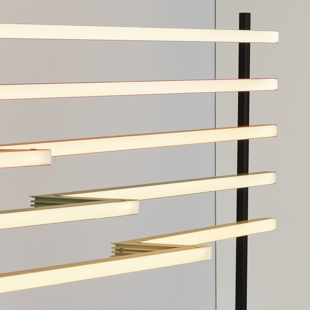 The three-dimensional collection was a marriage between metal and intricate original custom joiners and brackets that were produced using a 3D printer. The 3D printed joins were created to enable the exploration of unique music-inspired forms shaped through multiple angles. All light-emitting diffusers are precise, with no light leaks or dark spots.