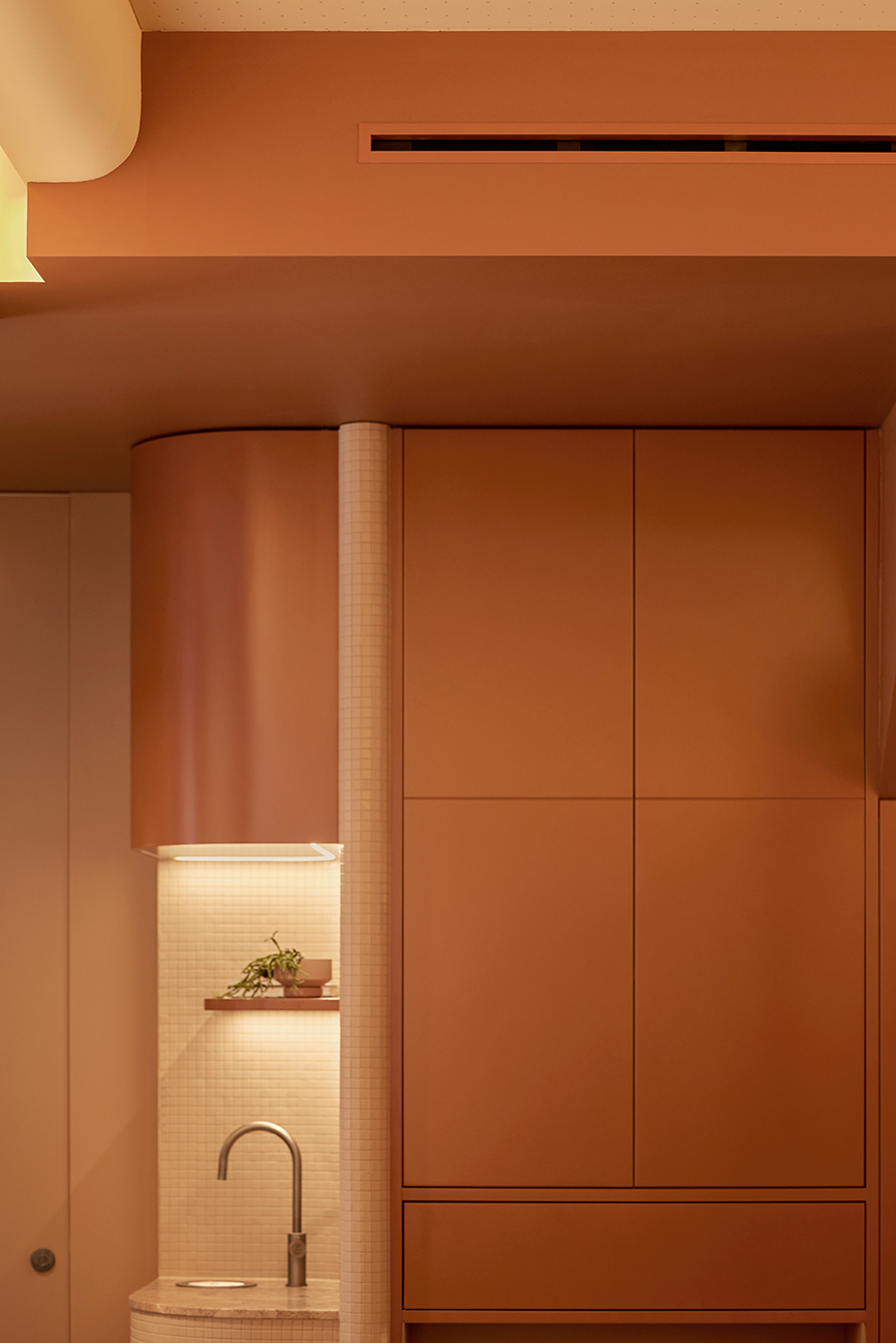 We utilised architecture elements to ‘hide’ the lights and set the desired mood. With the goal being to illuminate without any direct light while maintaining consistency and discretion, the use of ‘upside down’ lights and uplighting with Australian-made Symphony Lighting’s Rondo (tunable 1800k – 3k to address the mood challenge) was used to push light across the space. We worked with other spatial objects and materials such as the tinted mirror and felt tiles to add to the lighting effect and output.