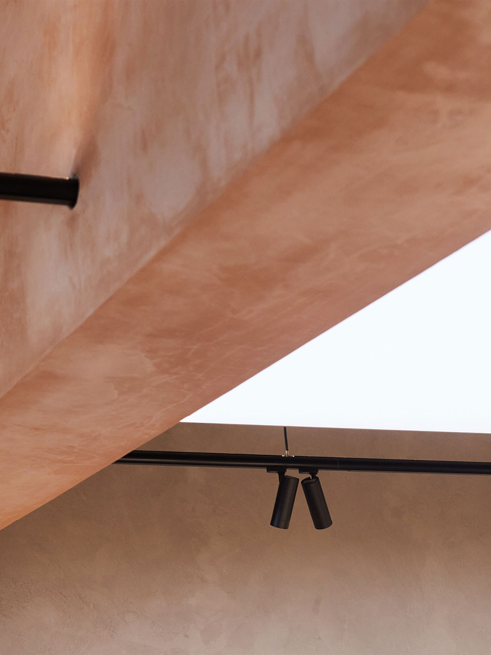 Central to the space is the custom linear uplight meets intricate track system that appears to disappear into through the bulkhead and remerge from the other side. The Good Design award-winning andro lives within a round custom track and it’s welcomed with a Piccolo uplight (from the Australian-made symphony range) that’s integrated within the track. The uplighting piccolo works to highlight textures, provide a wash and lend a layering of light to the space, further enhancing the residential feel.