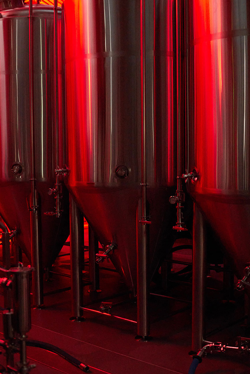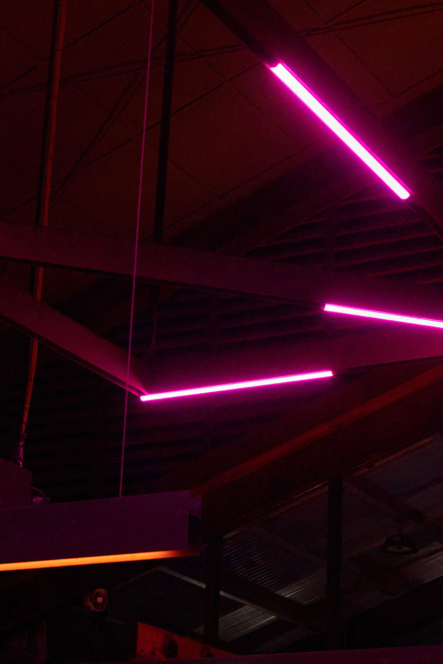The juxtaposition of the bespoke brushed aluminium luminaires against the rustic raw materials of the brewery is captivating. Everything is intentional, down to the downlights – we even sourced fixtures from decades past and refitted the modules for complete uniformity with 2400k consistency across the location.