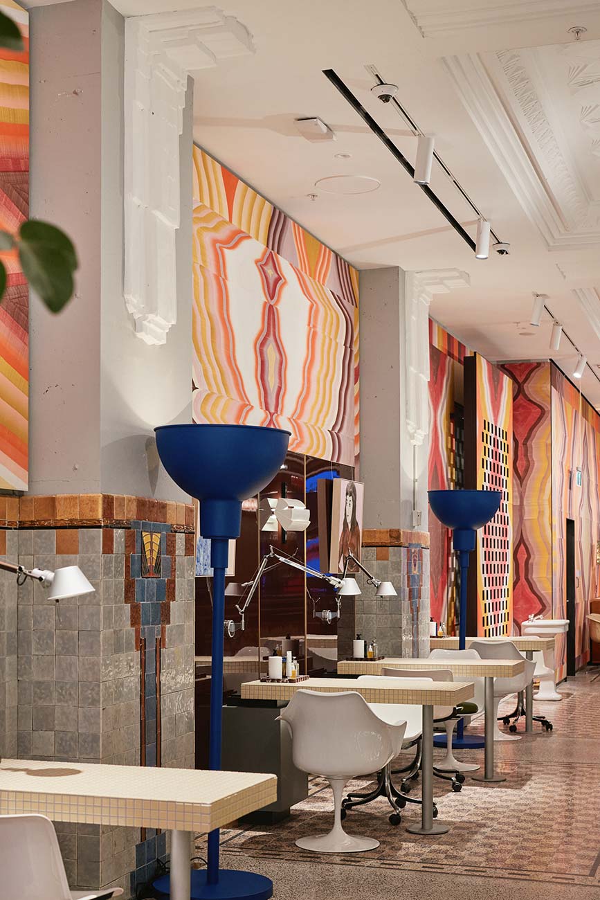Art also sits at the heart of the flagship. An eight-metre mural by Amsterdam duo Freeling Waters anchors the space, alongside curated works by international and Australian female artists including Nabilah Nordin, Julie Rrap, Atong Atem, Bethan Laura Woods, Christina Zimpel, and Patricia Piccinini. These installations were enhanced with gallery-style spots and projectors, framing each piece with museum-grade precision.