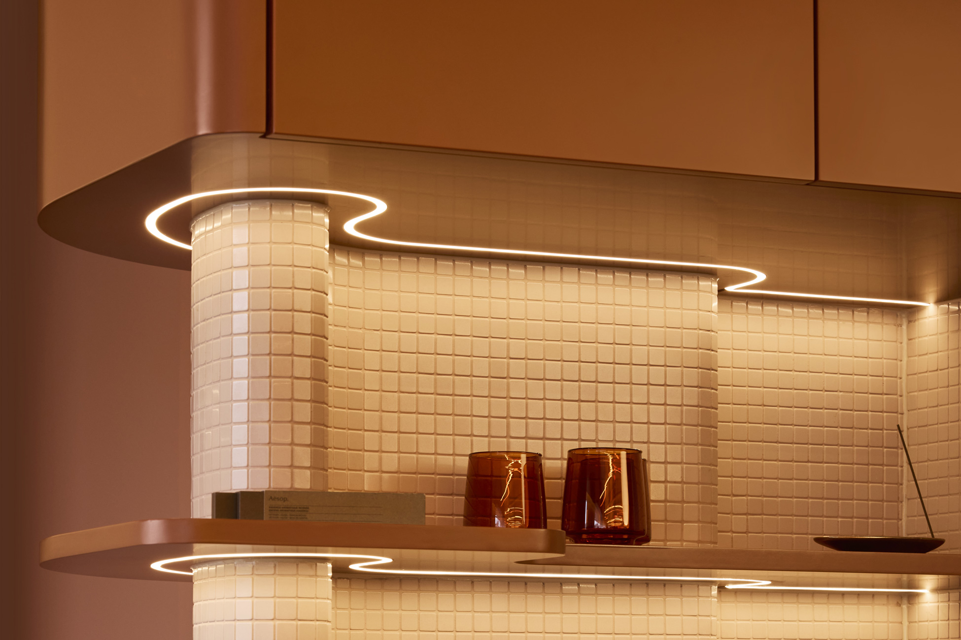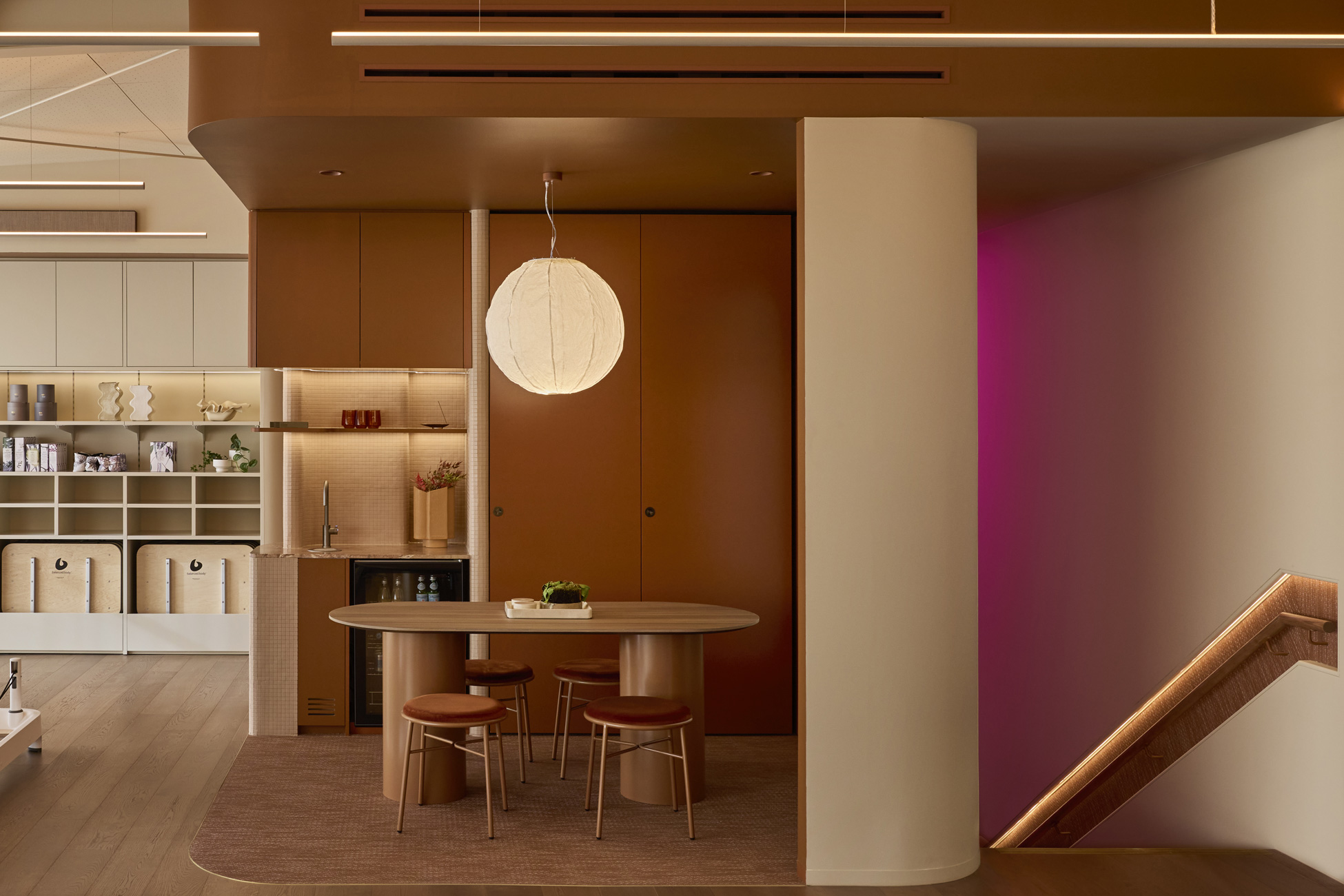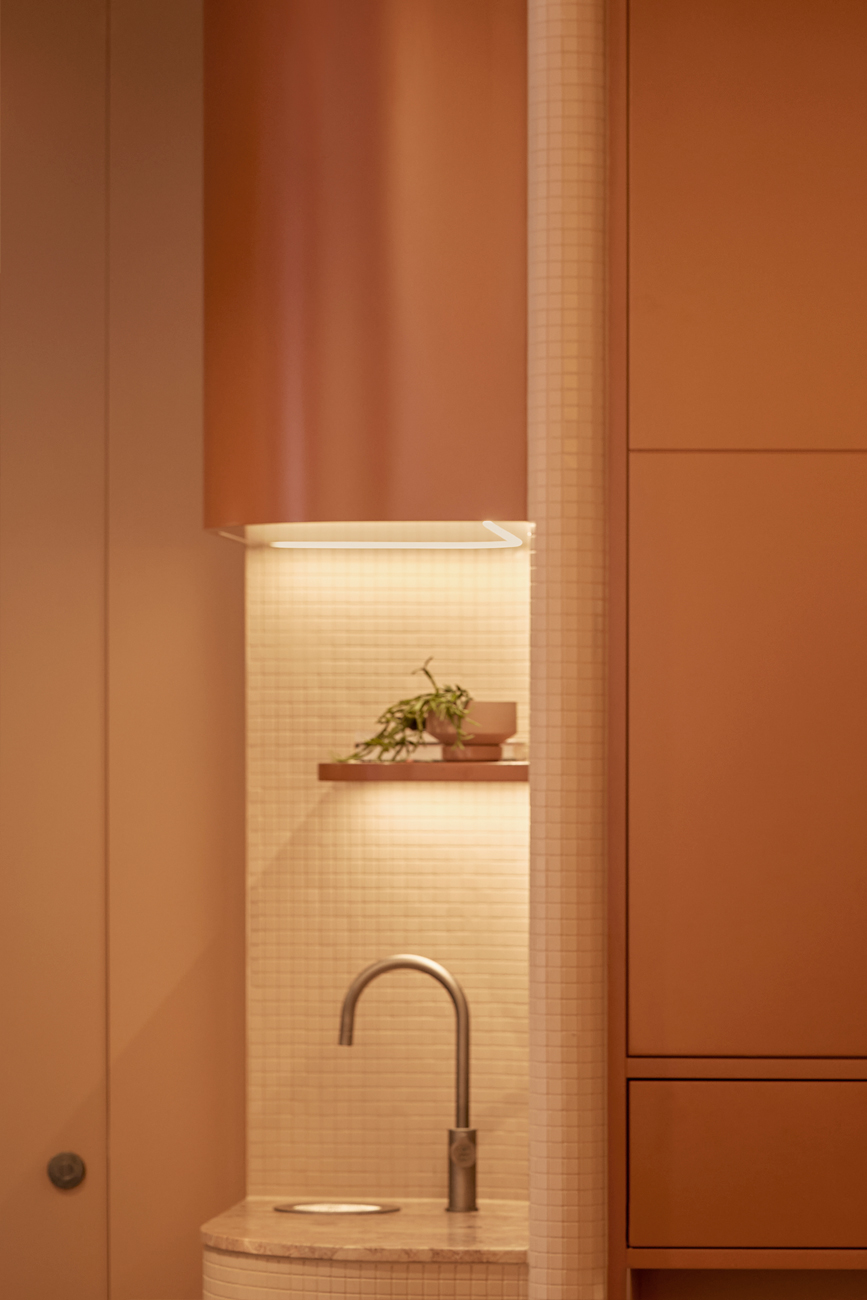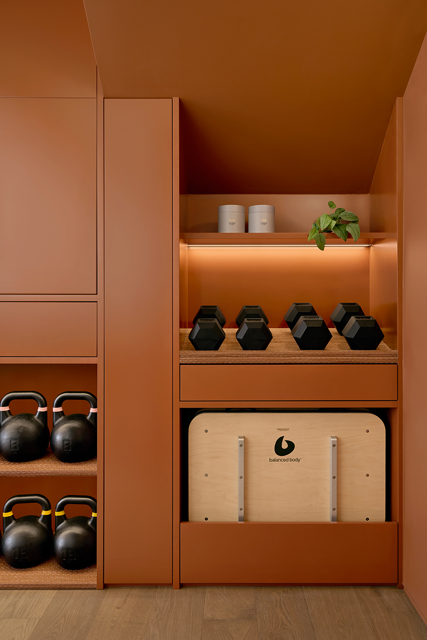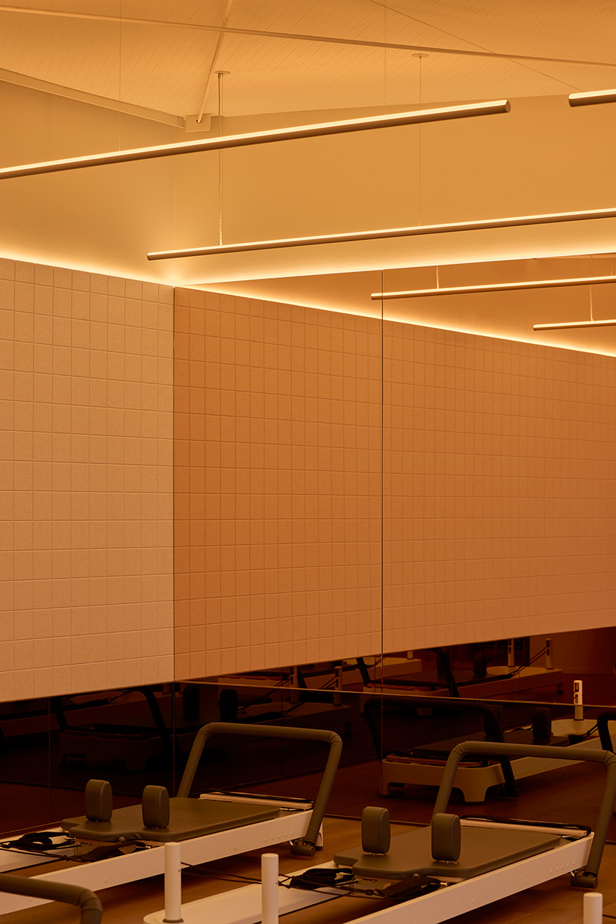 Showcased in the main studio is the tunable white, up-indirect linear pendants matched to the terracotta colouring of the finishes. These luminaires are sublime in their elegance and simplicity of design. They were selected and optimised to give illumination the freedom to bounce from the ceiling and meander throughout space. This was created so clientele are not staring directly into cumbersome light while performing their routines. The pendants are also strategically positioned in line with the Pilates machines so that at any angle in the coloured mirror they align.