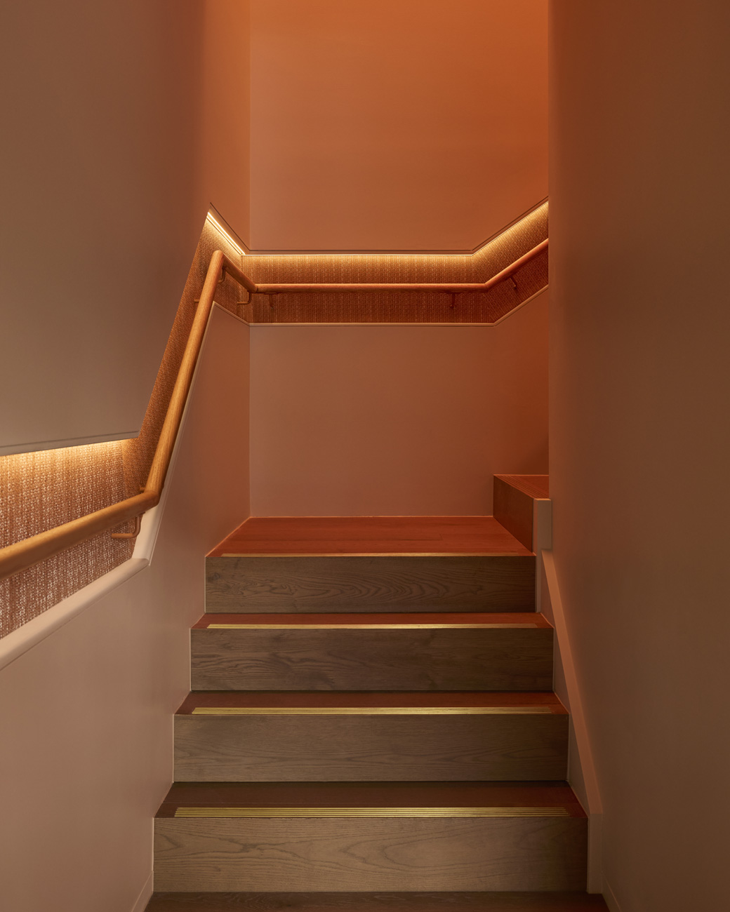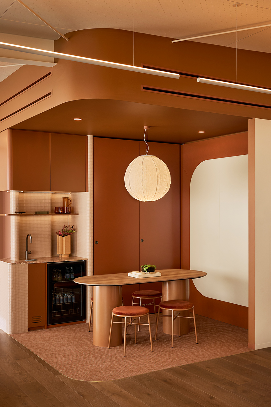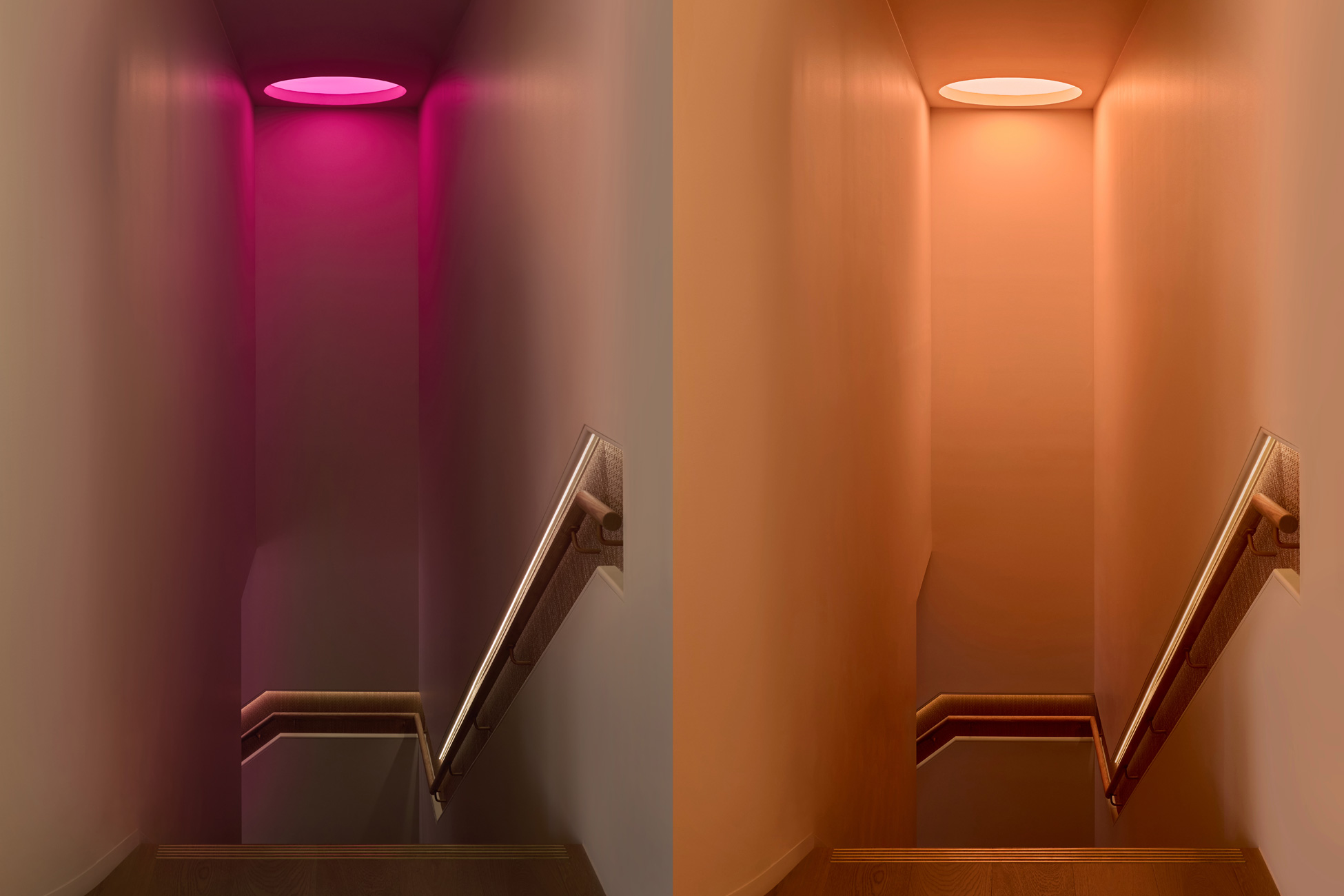 Natural light works hand-in-hand with the artificial lighting throughout the space, and in some places, luminaires work to mimic the natural light. None more striking than the hallmark of the space, the utterly mesmerising stretched fabric false skylight in the staircase. Inspired by traditional Japanese use of light, the RGBW stretched fabric with Bluetooth dimming features a rigorously developed light source that encompasses the perimeter. The brighter glow around the outskirts gradually and evenly peters off, in an arresting gradient derived from how one envisages the sun. And because it’s RGBW, the staircase can alter modes for different moments – like those cheeky drinks mode, which can become little bolder, and the pink also becomes a little hotter.