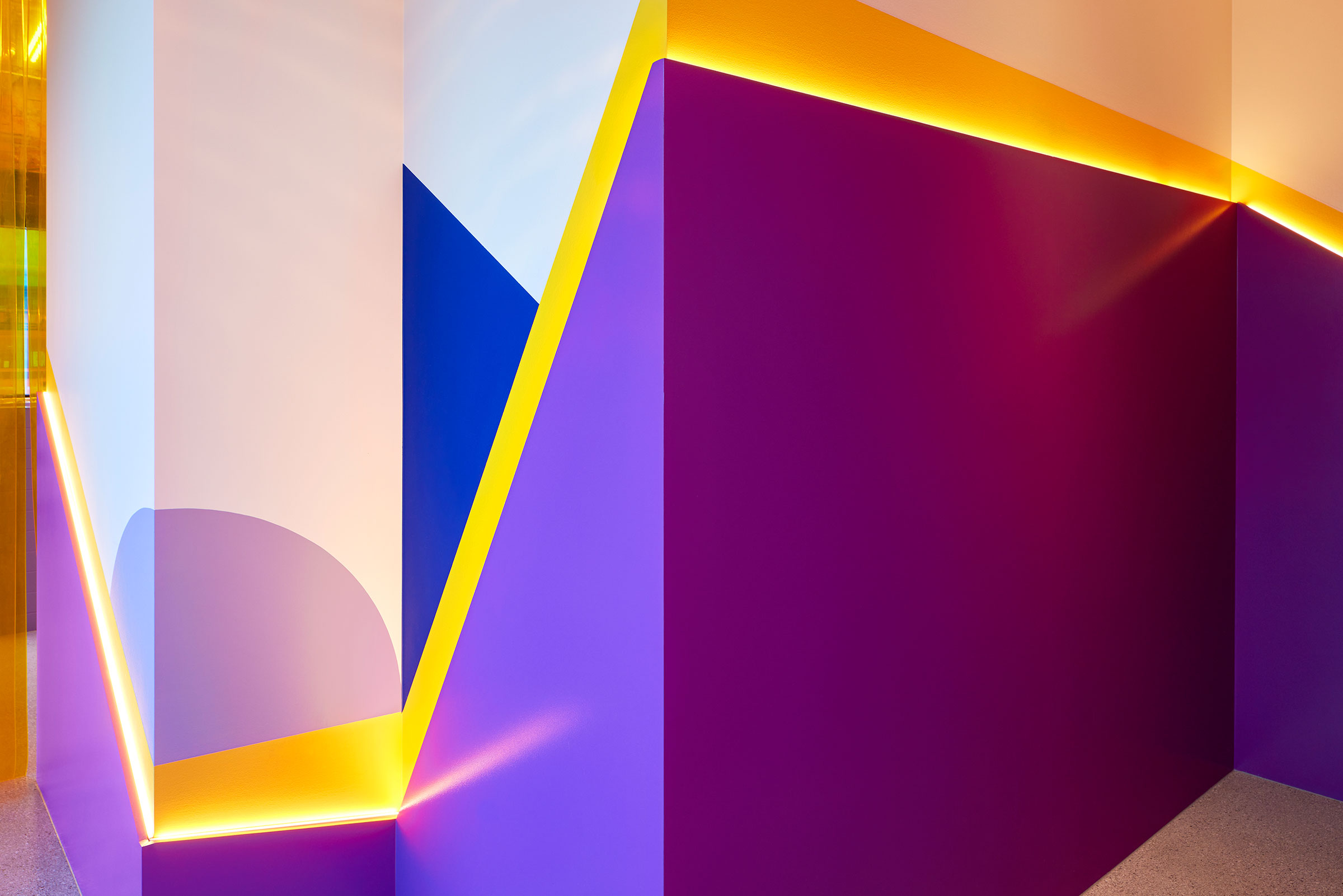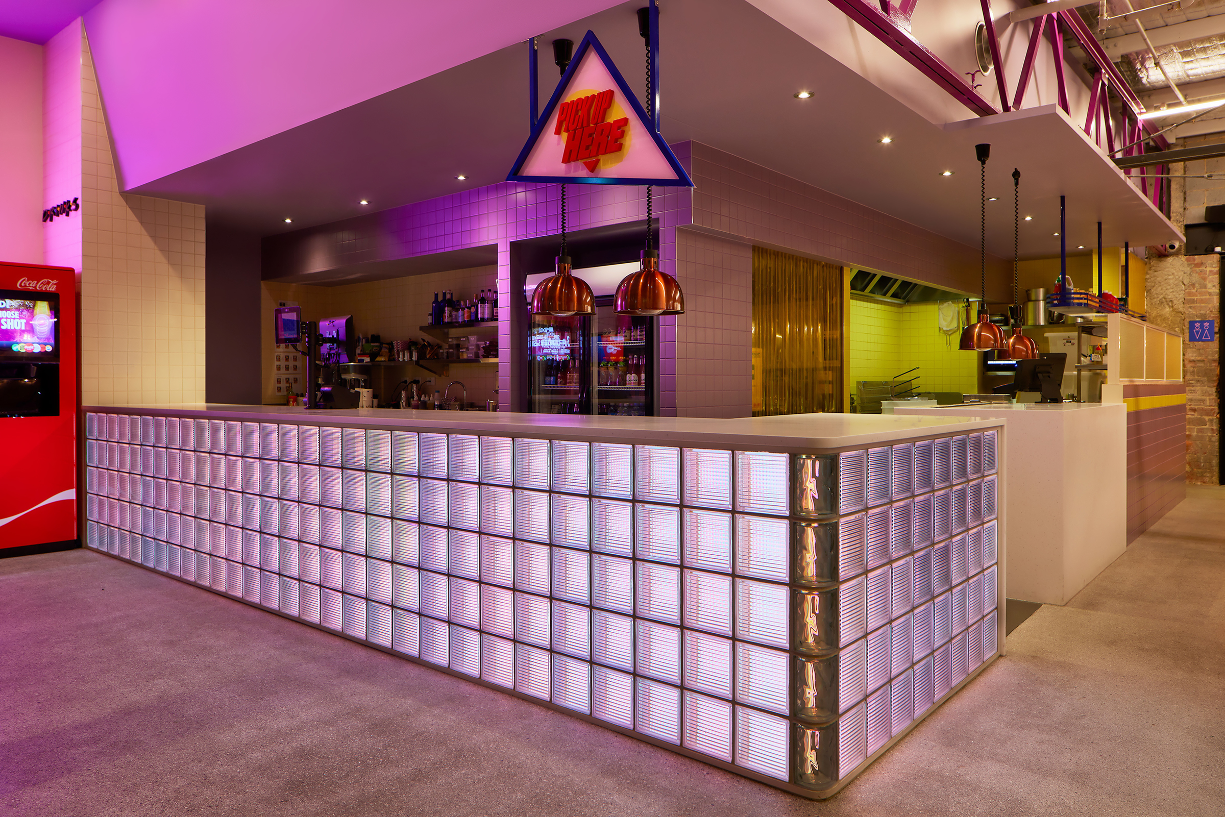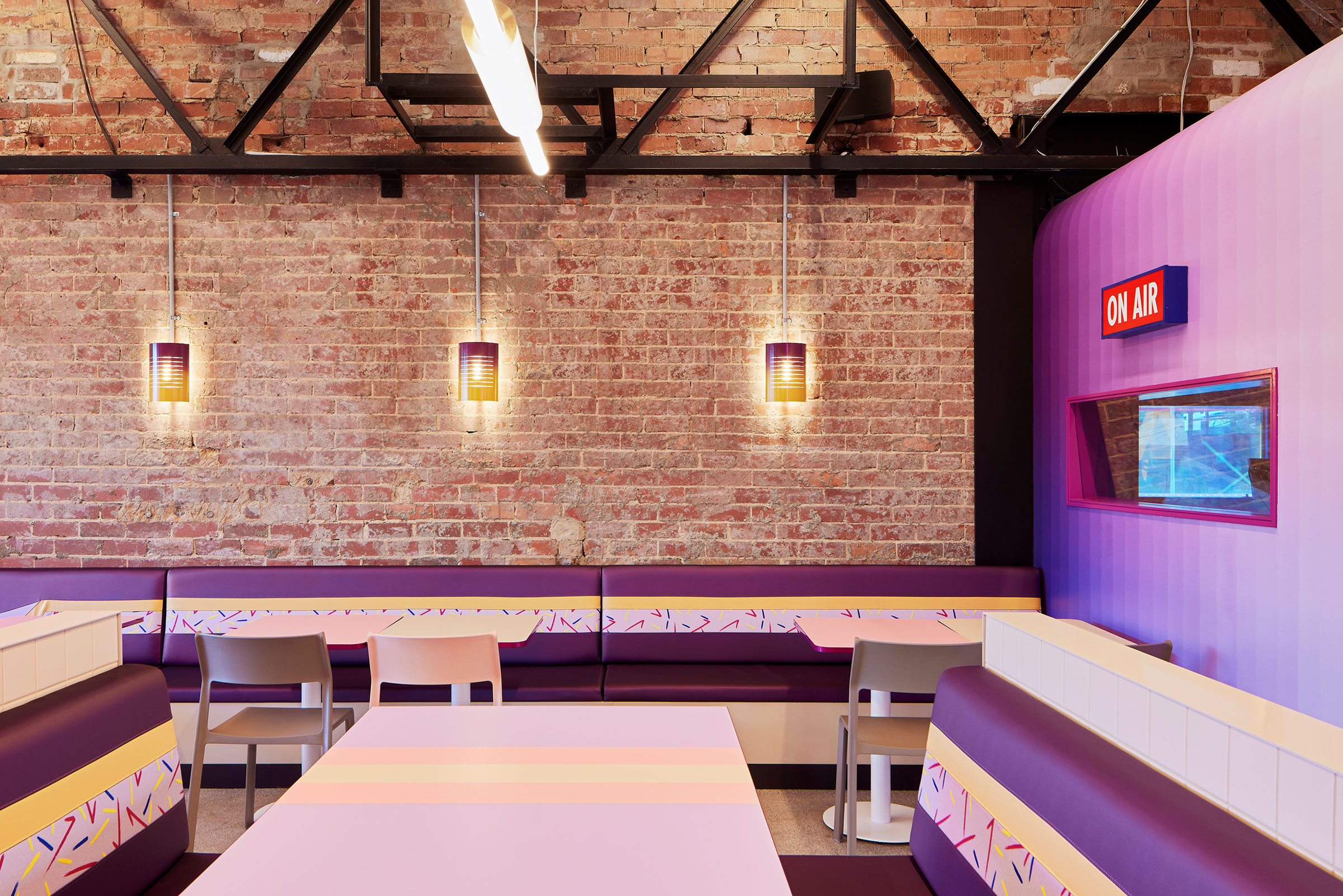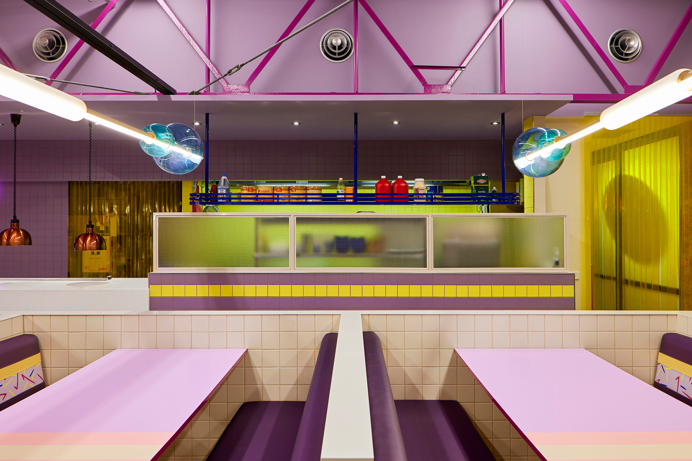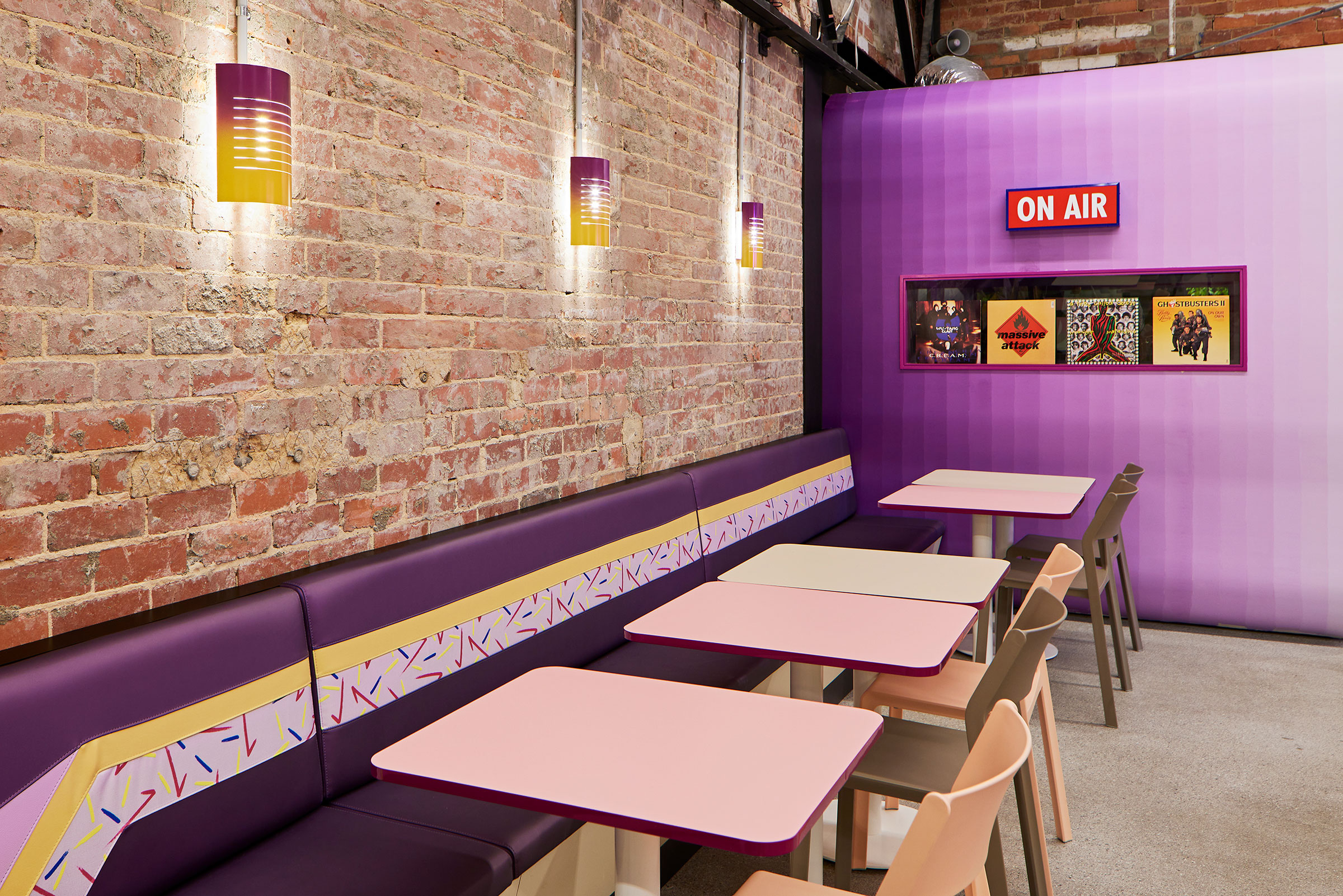 The space is a step into 1990s suburban and popular culture. Hallmarks include bold colour and graphic design across customised joinery and upholstery.