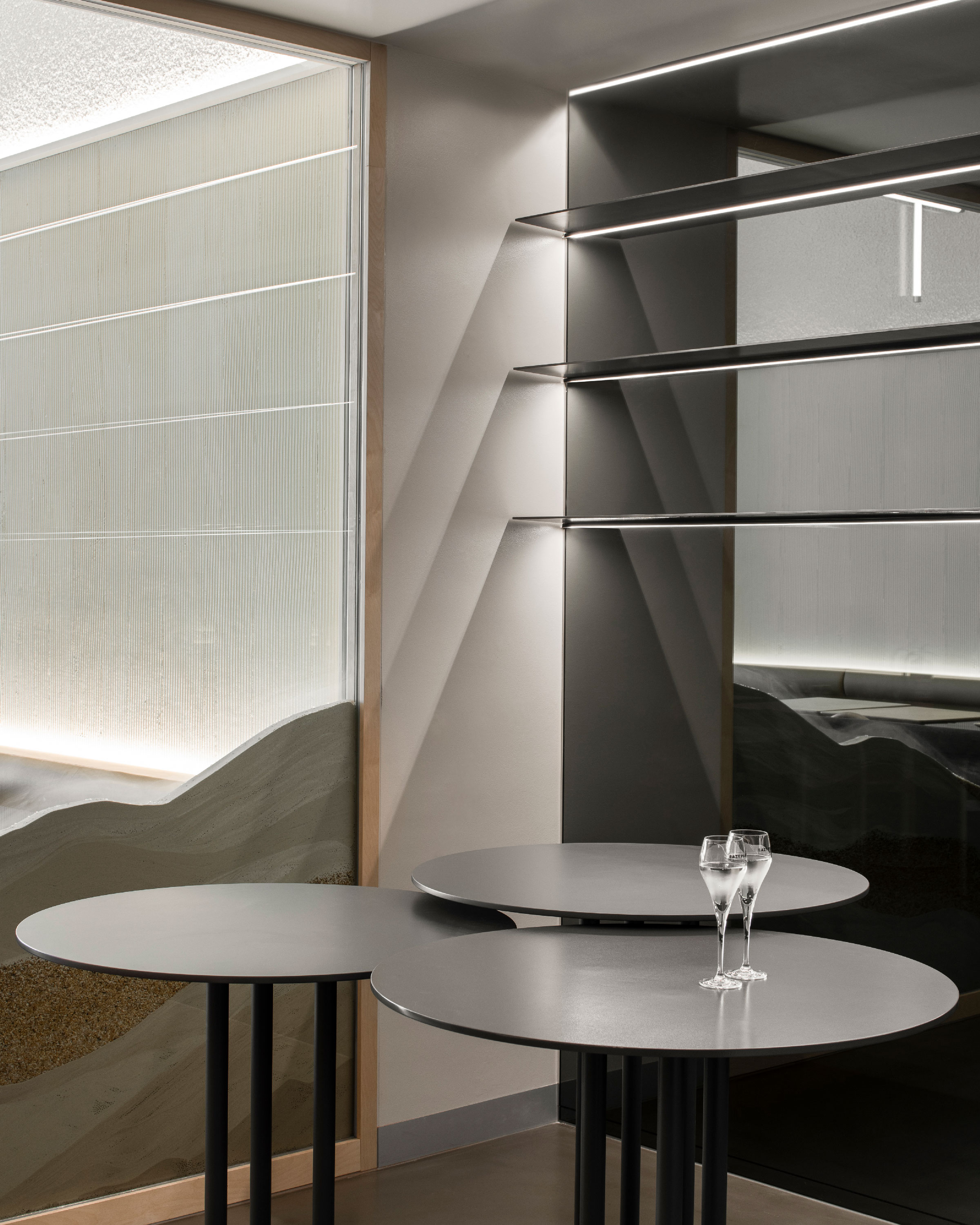The concept behind this space was to illuminate a miniature Japanese landscape. Experimentation was key in achieving the desired distribution and spread of light so that the illumination accomplished the task of lighting the space functionally but also grazed the carefully considered interior layers and textures.