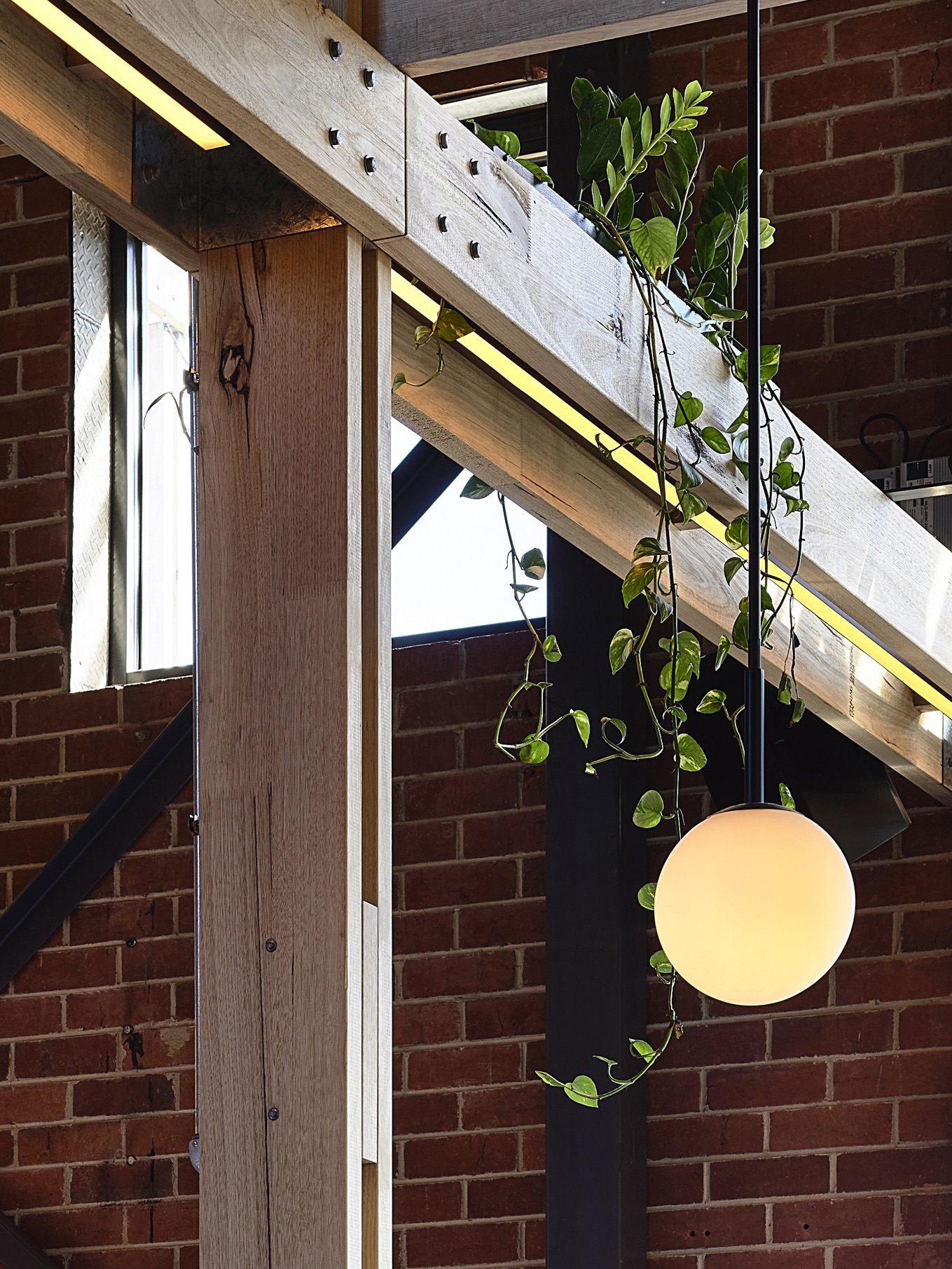 In a commitment to sustainability and integration with the design intent, the team took the extraordinary step of making a number of the light fixtures themselves. The team also repurposed, refurbished and then reused abandoned fixtures from the original factory.