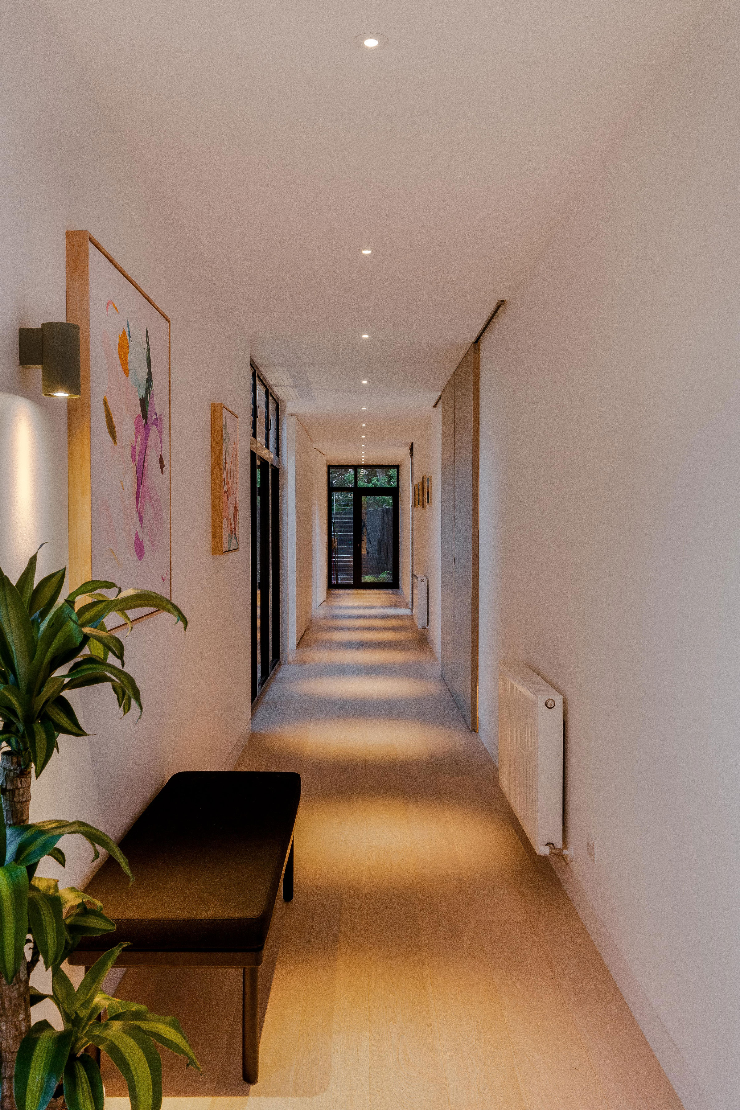 In the hallway, gentle pools of light that we have grazing and blanketing the hallway take their inspiration in replicating the corridor of boutiquey (I know it’s not a word and I promise not to use again) hotels. Plus, the light pools have the added bonus of being fun to hop & jump into. The luminaire of choice here is the teeny-weeny Mo Pin spots which also have the versatility to angle and light artwork if required.